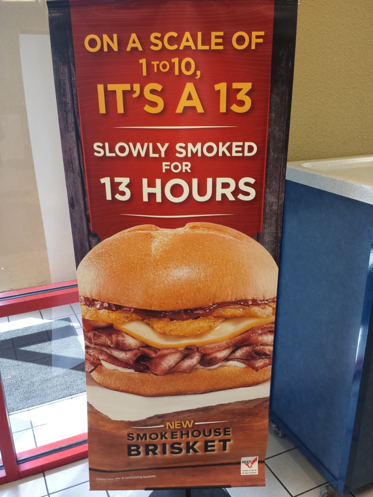 13-hour smoked brisket with crispy onions, cheddar cheese, and smoky BBQ sauce on a toasted brioche bun. TM & © 2024 Arby's IP Holder, LLC.Visit arbys.com for nutritional and allergen information.